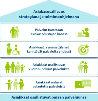 - Asiakas on osallinen omassa palvelussaan, kun hänen tarpeensa ja näkemyksensä tulevat ymmärretyksi ja niillä on myös merkitystä ja vaikutusta hänen palveluihinsa.