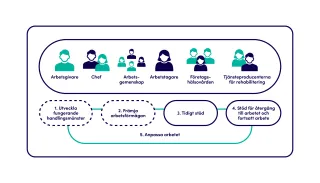 I videon nedan (längd 4 min 42 sek) beskrivs de olika skedena i rehabilitering anknutet till arbetet och dess olika metoder. Inställningarna för webbläsarens kakor kan påverka videons visning.