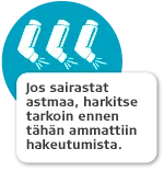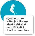Astma ei ole este suuhygienistin uralle. Jos kuitenkin sairastat vaikeampaa astmaa, harkitse tarkoin ennen alalle ryhtymistä. Keskustele ammatinvalinnasta astmaasi hoitavan lääkärin kanssa.