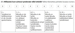 Kykyviisari sisältää kysymyksen, jossa vastaajaa pyydetään arvioimaan suhdettaan työelämään janalla. Janan asteikko on kymmenportainen. Numero 0 tarkoittaa, että vastaaja ei koe työelämän olevan hänelle ajankohtainen ja 10 taas sitä, että hänellä on hyvät edellytykset toimia työelämässä. Työelämään osallistumisessa raja-arvona on 6, joka tarkoittaa, että vastaaja on töissä, mutta hän tarvitsee tukea siellä pysyäkseen (Kuva 1).