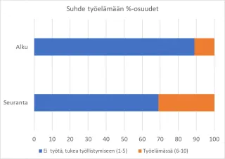 Hankkeiden alussa vastaajat arvioivat suhteensa työelämään olevan 4,1. Seuranta tehtiin vähintään kolmen kuukauden kuluttua hankkeen aloituksesta, jolloin suhde työelämään oli 5,1. Miehet arvioivat olevansa lähempänä työelämää kuin naiset sekä hankkeen alussa että seurannassa. Kukaan vastaajista ei kokenut, ettei työelämä tai työllistyminen olisi ajankohtaista.