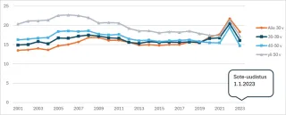 Vuoden 2022 piikki sairauspoissaoloissa näkyi kaikissa ikäryhmissä, ja vuonna 2023 on palattu edellisten vuosien tasolle.