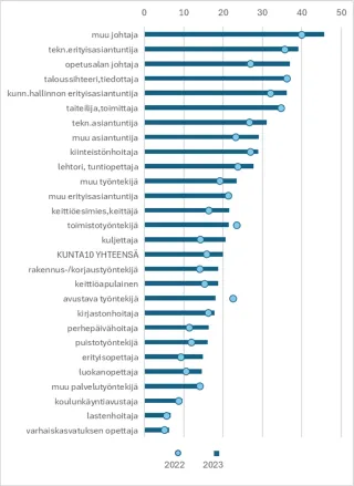 Työterveyslaitoksen Kunta10-tutkimuksessa on seurattu 11 kunnan työntekijöiden sairauspoissaoloja vuodesta 2000 alkaen. Sote-uudistus vei vuoden 2023 alussa sosiaali-, terveys- ja pelastusalojen työntekijät suurelta osin pois kuntien palkkalistoilta. Suurimmat ammattiryhmät kunnissa ovat nykyään esimerkiksi koulujen ja varhaiskasvatuksen opettajat, joiden määrä tutkimusaineistossa on pysynyt suhteellisen muuttumattomana.