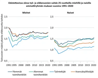 – Vuonna 2020 ylemmissä toimihenkilöammateissa työskentelevillä naisilla oli odotettavissa 1,6 työvuotta kutakin eläkevuotta kohden ja työntekijäammateissa 1,2 työvuotta jokaista eläkevuotta kohden. Miehillä puolestaan odotettavissa oleva työ- ja eläkevuosien suhde oli ylemmissä toimihenkilöammateissa 1,8 ja työntekijäammateissa 1,6, sanoo Leinonen.