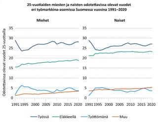 Odotettavissa oleva eläkkeelläoloaika piteni miehillä noin seitsemän kuukautta ja pysyi naisilla ennallaan vuosien 2010–2020 aikana. Vuonna 2020 eläkevuosia oli odotettavissa miehillä vajaat 19 ja naisilla noin 23 vuotta.