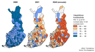 Kuva: Väestöllinen huoltosuhde 2000, 2021 ja 2040 (ennuste)