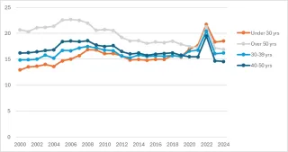 Sickness absence among municipal employees under the age of 30 continue to show a worrying development. Although the peak during the coronavirus pandemic levelled off, level of sickness absence among young people is clearly higher than in older age groups.
