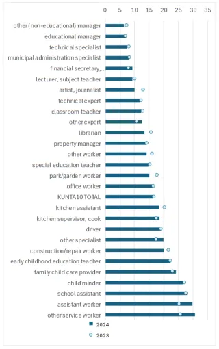 Figure 2. The average number of sickness absence days per person-year in 2024 and 2023 in the major occupational groups of the municipal sector. Full-time employees. Kunta10 study, Finnish Institute of Occupational Health.