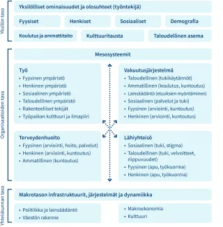 Hyvinvointialueen tai sote-keskuksen alueella työkykyä voi tarkastella väestötasolla esimerkiksi kanadalaisen tutkijaryhmän kokonaisvaltaisen mallin mukaisesti, joka on kuvattu Kuvassa 1.
