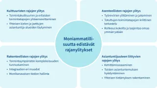 Monialainen ja moniammatillinen työskentely on rajojen ylittämistä (Kuva 3). Rajat voivat olla kulttuurisia, asenteellisia, rakenteellisia ja asiakkaan asemaan liittyviä. Rajojen ylittäminen edellyttää ammattilaisilta kärsivällisyyttä ja keskinäistä luottamusta. Ammattilaisten pitää tunnistaa ja tunnustaa toistensa osaaminen.