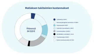 Kustannukset Matiaksen saamista palveluista, tukitoimista ja etuuksista jakautuivat Liikennevakuutuskeskuksen tietojen mukaan seuraavasti (Kuva 7):