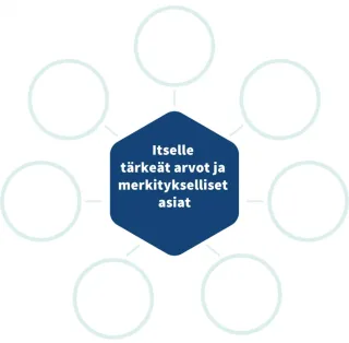- Kirjoita kehällä oleviin palloihin asioita, jotka kuvastavat sinulle tärkeää arvoa tai asiaa elämässä. Voit täysin vapaasti itse määritellä sen, mikä on sinulle tärkeää. Kirjoita jokaiseen palloon yksi asia. Saat vapaasti itse päättää, montako arvoa tai tärkeää asiaa analyysiisi tulee.