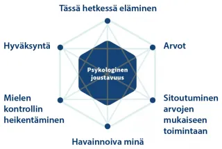 Psykologinen joustavuus on taito, jota voidaan kehittää kuuden prosessin tai osa-alueen avulla: