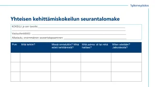 Kehittämiskokeilujen valitsemisen yhteydessä on hyvä sopia myös seurannasta: miten kehittämisen etenemistä seurataan ja milloin kokoonnutaan arvioimaan satoa. Alla on esimerkki seurantalomakkeesta, joka on yksi tapa koota kehittämisen aikaiset kokemukset ja oivallukset muistiin arviointia ja kokeiluideoiden edelleen kehittelyä varten.