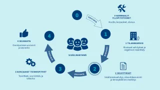 Työpaikan sisäilmaongelmia kannattaa ratkoa vaiheittain ja systemaattisesti. Tätä varten Työterveyslaitoksella on kuvattu toimintamalli. Mallin jokaisessa vaiheessa avoin ja vuorovaikutteinen viestintä työyhteisössä on keskeistä. Alla olevassa kuvassa näet mitä vaiheita toimintamalliin kuuluu.