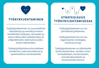 Työkykyjohtaminen on suunnitelmallista ja kokonaisvaltaista toimintaa, jossa työkyky ymmärretään laaja-alaisesti. Se sisältää sekä ennakoivia, että työssä jatkamista ja työhön paluuta tukevia toimia, joissa