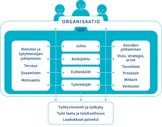 Työntekijän työhyvinvointia ja työkykyä tuetaan monen eri tahon yhteistyönä. Organisaation johdon ja henkilöstöhallinnon (HR) tärkeitä strategisia yhteistyökumppaneita työkykyjohtamisessa ovat muun muassa työterveyshuolto, eläkevakuutuslaitokset, Kela ja kuntoutuspalvelut (Kuvio 4).