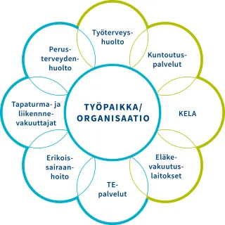 - tuetaan työntekijän työssä jatkamista ja työhön paluuta yhteistyössä muiden toimijoiden kanssa.