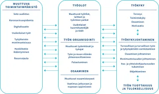 Sosiaali- ja terveydenhuoltoalalla tehdään yhteiskunnallisesti arvokasta työtä. Useat, samanaikaisesti vaikuttavat ja toisiinsa kietoutuneet muutokset, kuten sote-uudistus, koronavirusepidemia, digitalisaatio ja resurssipula kuitenkin muuttavat työoloja, töiden organisointia ja henkilöstön osaamistarpeita (Kuvio 1). Työntekijät ovat jatkuvasti uuden edessä, mikä saattaa vaarantaa osaamisen ja motivaation, mutta myös terveyden ja toimintakyvyn. Tällä on puolestaan vaikutuksia työn tuottavuuteen ja tuloksellisuuteen.