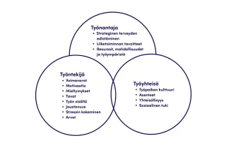 Työpaikoilla on monia mahdollisuuksia terveellisten elintapojen edistämiseen. Toiminnan suunnittelussa ja kehittämisessä on kuitenkin otettava huomioon työpaikan strategia ja liiketoiminnan tavoitteet sekä työntekijään ja työyhteisöön liittyvät tekijät (Kuvio 6).