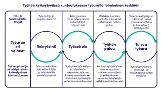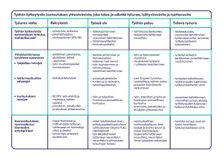 KUURA-hankkeessa työhön kytkeytyvällä kuntoutuksella tarkoitamme laaja-alaisen työkykykäsityksen mukaisesti työkykyä, työssä pysymistä, työhönpaluuta ja tulevaa työuraa tukevaa monialaista työpaikan ja sen kumppaneiden yhteistoimintaa (Kuvio 3).