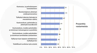 Työkyvyn tukeen liittyvä ohjaus ja neuvonta oli tutkimuksen mukaan työkykykoordinaattoreiden ja muiden koordinoivaa työtä tekevien keskeisin työtehtävä. Keskeisimpinä työtehtävinään koordinoivaa työtä tekevät pitivät asiakkaan kuntoutus- ja palvelutarpeen tunnistamista, monitoimijaista yhteistyötä asiakasprosessissa sekä työkykyä tukevien keinojen ja menetelmien valintaa (Kuva 4).