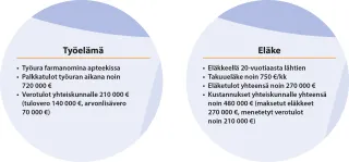 Kuva 3. Kustannukset ja tulot, jos Matias on työelämässä tai eläkkeellä.