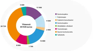 Matiaksen saamat kuntoutustoimenpiteet 10 vuoden aikana maksoivat yhteensä 84 920 € (Kuva 2). Ammatillisena kuntoutuksena maksettu nuoren kuntoutusraha (30 720 €) oli kolmannes kaikkien työkyvyn tukitoimien kustannuksista. Jos Matias työskentelisi farmanomina kokopäiväisesti koko työuransa ajan, hänen ansionsa koko työuran aikana tulisivat olemaan 716 058 euroa. Hän maksaisi tuloveroa yhteensä 142 138 euroa ja arvonlisäveroa arviolta 70 870 euroa. Näiden laskelmien perusteella Matiaksen kuntoutus on ollut taloudellisesti kannattavaa sekä hänen itsensä että yhteiskunnan kannalta.