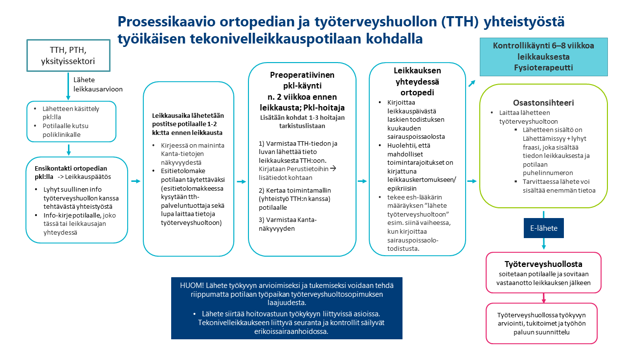 TYÖOTE-toimintamallia on hyödynnetty eniten lonkan ja polven tekonivelleikatuille potilaille, mutta toimintamalli sopii hyvin myös muihin kirurgisiin toimenpiteisiin sekä kardiologisille, neurologisille, fysiatrisille, psykiatrisille, trauma- ja syöpäpotilaille. Alla löydät esimerkin tekonivelleikkauksen TYÖOTE-prosessista. Yhteistyö muokkautuu hyvinvointialueilla paikallisten tarpeiden ja erityispiirteiden mukaan. Avaa kuva suurempana.