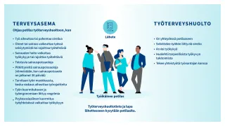 Iso osa työssäkäyvästä väestöstä asioi sekä työterveyshuollossa että julkisessa perusterveydenhuollossa. Tällä hetkellä ei ole yhtenäisiä toimintamalleja siihen, miten potilaita ohjataan toimijalta toiselle ja miten tieto liikkuisi toimijoiden välillä mahdollisimman tehokkaasti.Työkykyasioiden systemaattinen ohjaus julkisesta perusterveydenhuollosta työterveyshuoltoon parantaa työkyvyn tukea ja lisää tuottavuutta ja helpottaa terveysasemien henkilöstön työtä.