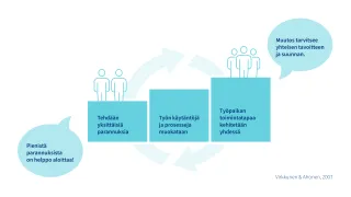 - Kehittäminen voi vähitellen laajentua kohti monimutkaisempia prosesseja ja kokonaisuuksia, kun työyhteisöllä on suunnasta ja tavoitteista yhteinen käsitys.