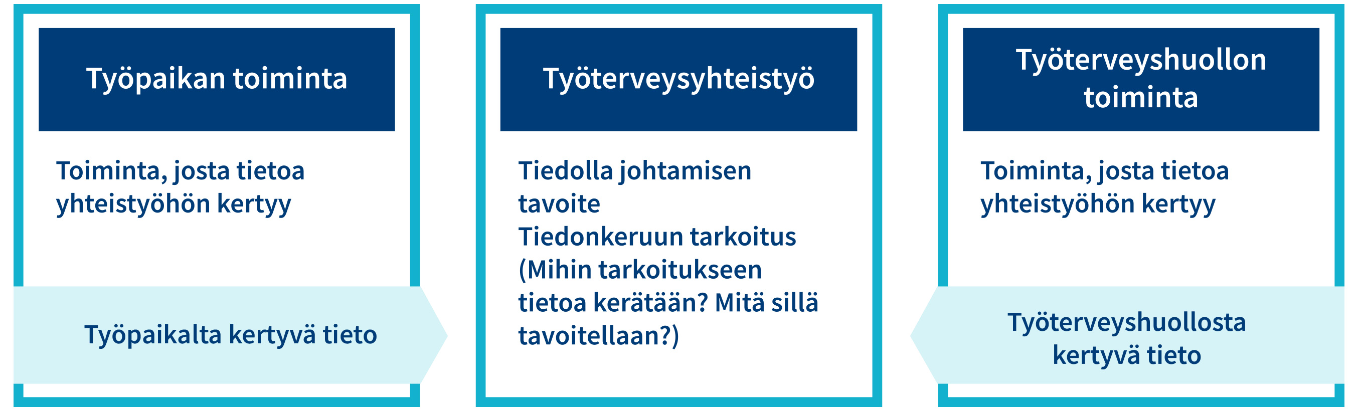 Tiedon hyödyntämisen tavoitteet sekä toimenpiteet niiden saavuttamiseksi tulee määritellä työterveysyhteistyössä. Tavoitteiden perustana tulee olla yhdessä todetut työkykyjohtamisen tarpeet, jotka voivat olla erilaisia työpaikasta ja sen tilanteesta riippuen. On hyvä hahmottaa, että tiedon hyödyntäminen ja tiedonhallinta eivät ole muusta työkykyjohtamisesta erillisiä asioita vaan arjen yhteistyön toimintojen sekä niistä kertyvän tiedon tarkastelua yhteisesti sovittujen tavoitteiden saavuttamiseksi.