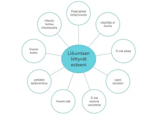 - Tässä harjoituksessa tunnistetaan liikuntaan liittyviä esteajatuksia. Kirjoita vapaasti muotoillen liikuntaan liittyviä esteitä, jotka voivat olla syitä tai perusteluja sille, että et tule liikkuneeksi. Voit tarkastella esteitä aikaisempien kokemustesi tai tämänhetkisten tilanteiden tai tapahtumien valossa.