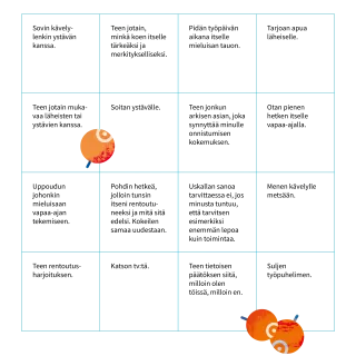 Palautuminen on pieniä arjen tekoja. Millaisia psykologisen palautumisen keinoja sinä kokeilet työpäivän aikana ja vapaa-ajalla tällä viikolla? Bingo syntyy jokaisesta täydestä rivistä, sarakkeesta tai vinorivistä.