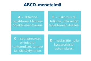 Hyvinvointia estävien uskomusten muuttaminen ABCD-menetelmällä. Harjoittele kyseistä tekniikkaa päivittäin niin opit vaikuttamaan sisäiseen puheeseesi. Voit muuttaa sisäisen äänesi kannustavaksi, arvostavaksi, lohduttavaksi ja jopa väitelläkin kielteisten ajatustesi kanssa. Kokeile!