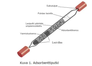 - Katkaise putken päät (Tarvitsee katkaista vain sen verran että ilma pääsee kulkemaan putken läpi. Varo terävää lasia) ja aseta putki pumpussa olevan letkun päähän siten että pienempi adsorbenttikerros (varmistuskerros; kerrokset erotettu toisistaan lasivillalla) osoittaa pumppua kohden (Kuva 1).