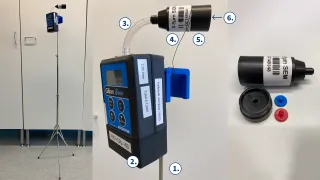- Näytteenoton päättyessä kirjaa ylös kellonaika tai lue näytteenottoaika suoraan pumpun näytöltä. Suodattimen läpi imetyn ilman tilavuus lasketaan kalibroidun pumpun kalibrointikertoimen ja käytetyn ajan perusteella.