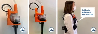 - Irrota letku näytekeräimestä ja näytekeräin pidikkeestä sekä Millipore-kasetti syklonista varovasti. Älä käännä syklonia, ettei suodattimelle varise ylimääräistä pölyä. Sykloni voi tarttua tiukasti kiinni suodatinkasettiin; on oltava varovainen ettei suodatin putoa.