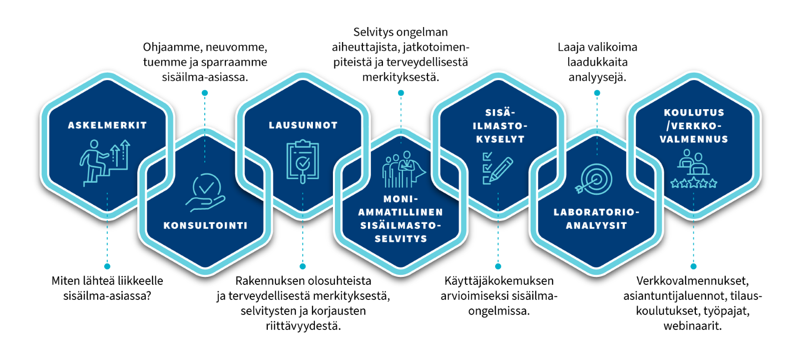Työterveyslaitos tarjoaa myös monimuotoista koulutusta sisäilmaongelmien ratkaisemiseen ja erilaisiin sisäilmatilanteisiin. Käytettävissäsi on rakennusterveysasiantuntija, lääkäri ja työyhteisöasiantuntija tarpeidesi mukaan.