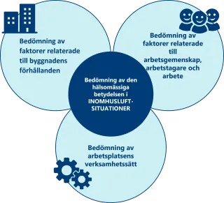 Vid Bedömning av den hälsomässiga betydelsen används resultaten från inomhusklimatundersökningen och bedömningen av förhållandena. En bedömning av förhållandena ger en helhetsbild av inomhusluftens kvalitet och förhållandena i byggnaden. Inomhusklimatundersökningen är däremot en studie av byggnaden och ventilationen som genomförts för bedömning av förhållandena.