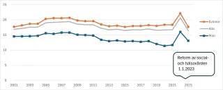 Statistiken från Keva och FPA stödjer emellertid hypotesen om en nedåtgående trend för sjukfrånvaro. I Kevas statistik sjönk sjukfrånvaron för personal inom den offentliga sektorn år 2023 till nästan samma nivå som år 2021. Även FPA:s statistik över långa frånvaroperioder visar att det totala antalet personer som fick sjukdagpenning bland hela den arbetande befolkningen minskade med cirka 3 % mellan 2023 och 2022.