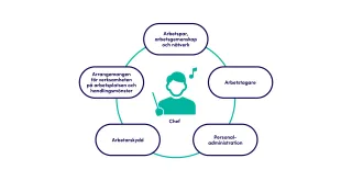 En del av ledningen av arbetsplatsen är att stödja personalens arbetsförmåga. Stödet för arbetsförmågan är också en del av det dagliga arbetet som arbetsgivarens representanter och chefen utför tillsammans med flera samarbetspartner på arbetsplatsen (Figur 13), inklusive företagshälsovården.