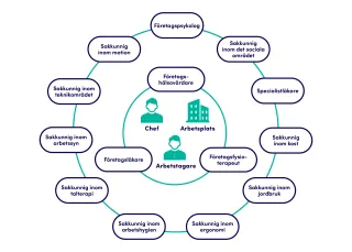 I det multiprofessionella teamet arbetar i allmänhet företagsläkaren, -vårdaren och företagsfysioterapeuten som företagshälsovårdspersonal. Företagspsykologen är sakkunnig. Andra sakkunniga som deltar kan till exempel vara sakkunniga inom det sociala området, näring, talterapi, jordbruk, optiker, det tekniska området, arbetshygien, ergonomi och motion samt specialistläkare (Figur 14). Klientens behov på arbetsplatsen styr företagshälsovårdens verksamhet och företagshälsovårdspersonalen, såsom företagsläkaren, -vårdaren eller -fysioterapeuten bedömer behovet av att anlita sakkunniga. Anlitandet av sakkunniga ska antecknas i avtalet om företagshälsovård och i verksamhetsplanen (se avsnitt 1.2. Modell för att stödja arbetsförmågan).
