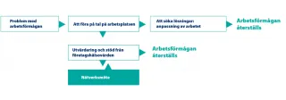 - Stöd arbetet med tanke på både arbetet och den anställdas behov – ”Vi håller redan på att planera organiseringen av ditt arbete när du kommer tillbaka till arbetet”, ”Har du haft tid att tänka på det? Vad tycker du om de planerade arbetsuppgifterna, arbetsmängden och arbetsarrangemangen för närvarande?”