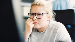 Työntekijä tutkii näyttöpäätettään silmälasit päässä.