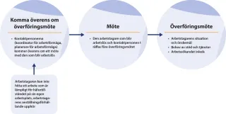 När en kund blir arbetslös och överförs från företagshälsovården till social- och hälsovårdscentralen och kund hos AN-tjänsterna kan de stödtjänster för arbetsförmågan som de behöver upphöra. En verksamhetsmodell har tagits fram för detta övergångsskede, med vilket man säkerställer en överföring av information om stöd för arbetsförmågan. Blanketterna som ingår i verksamhetsmodellen fylls i inom företagshälsovården och de kan överföras till de grundläggande tjänsterna med kundens tillstånd, eller av hen själv, till social- och hälsovårdscentralens team för stöd av arbetsförmågan och till sysselsättningstjänsterna. Vid överföring av uppgifter kan man använda FPA:s blankett Y100.