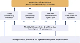 I denna modell har en svensk forskare (Bild 2, Tengland 2011, 2013) satt begreppet arbetsförmåga i centrum för arbetets meningsfullhet och kompetens både som yrkes- och arbetslivskompetens och som individens egna resurser.