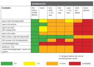 Handskmaterialet ska skydda mot de kemikalier som hanteras (information finns i säkerhetsdatabladet eller den här anvisningen).