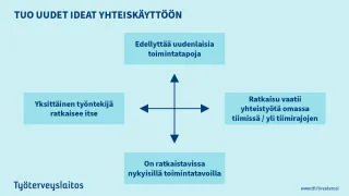 - Sopikaa, milloin palaatte asiaan. Kun palaatte asiaan, arvioikaa kokeilua työntekijän, työyhteisön ja organisaation näkökulmasta. Kehittäkää toimintatapaa yhdessä eteenpäin ja miettikää, miten se saadaan leviämään työyhteisössä.