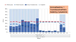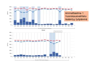 - Työpäivä tiistain 1. mittaus on jälleen viimeinen vapaalla ennen yövuoron alkua tehty mittaus ja tämän jälkeen tallennetaan kaikki yövuoron aikana tehdyt mittaukset ja keskiviikon aikana tehdyt mittaukset.